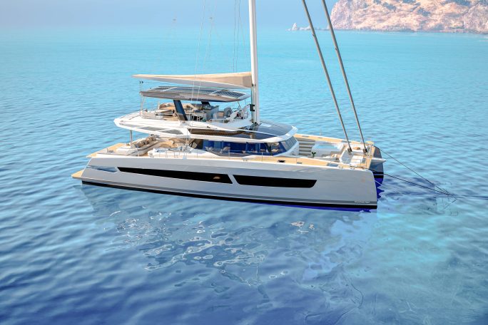 La cabina del armador rediseñada en el diseño del FP 48 posiciona la cama hacia las ventanas del casco para disfrutar de las vistas al mar. Los compradores pueden elegir entre múltiples distribuciones, con tres o cuatro camarotes dobles, lo que permite que el yate funcione igual de bien como un hogar en un crucero privado o como una embarcación amigable para el chárter.