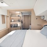 Inside, the FP 55 draws inspiration from the Aura 51, evident by the well-equipped galley, the full-height fridge and freezer, and the central island that separates the outdoor cockpit and the indoor galley. The salon includes a U-shaped lounge that can be arranged for dining or relaxation, while panoramic windows fill the space with natural light. The owner’s suite is accessed directly from the transom for added privacy. The owner’s cabin bed has been positioned facing the ocean with excellent hull-window views, and the stateroom is accompanied by a spacious bathroom and dressing area. Thanks to multiple guest cabin configurations, this yacht is flexible and comfortable enough for both private and charter use.