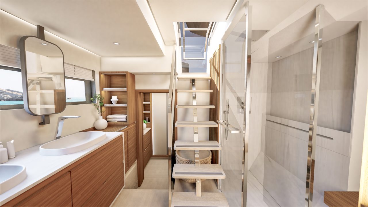 Adaptability is one of the FPY 70S’s greatest strengths. With up to eight layout options, owners can choose between a galley-up or galley-down configuration, three to six guest cabins, and up to five crew cabins, making the yacht ideal for extended private cruising or premium charter operations. Designed by Berret-Racoupeau Yacht Design, the FPY 70S catamaran delivers reliable performance and autonomy. Its 7,000 W solar array, 64 kWh lithium battery bank, and generator ensure the yacht can operate quietly and efficiently while underway or at anchor. At 22 meters in length with a 10.03-meter beam and 168 m² of sail area upwind, the 70S is as stable as it is high-performing. Large fuel and water capacities support extended cruising, and, together with the solar panels, it’s a yacht that offers true independence at sea. Every feature, space, and detail has been carefully crafted to create a new standard of living on the water.