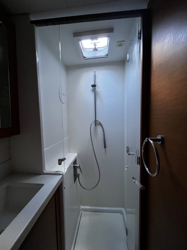 The four-cabin, four-head layout accommodates up to eight guests, with a bright salon featuring an L-shaped settee and U-shaped galley. The aft cockpit lounge provides additional seating, while the flybridge offers excellent visibility and control.