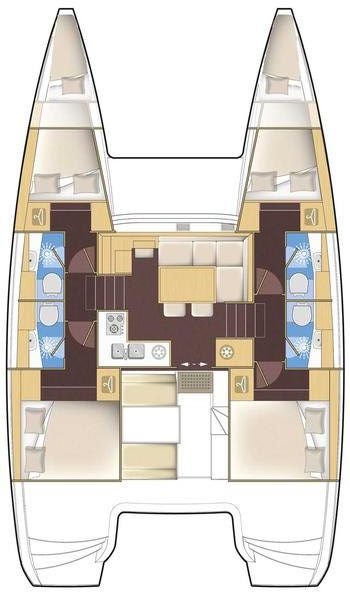 Manufacturer’s Comments: Boasting a new signature look, the 40 reveals her striking personality at first glance. The perfect marriage of interior comfort and optimized cruising, she represents a new generation of Lagoon. At the forefront of the Lagoon brand is Lagoon 40, one of their most popular models. Despite being a smaller model, Lagoon 40 clearly honours the brand’s high standards and is characteristic of Lagoon Catamarans in terms of design and spirit. It has a spacious layout and is known for both high comfort and personal style. Industry-leading construction methods ensure highest quality and top performance. Accommodations for up to 10-12 people. Offered in the 4-cabin layout which typically includes four double cabins with four en-suite bathrooms/heads. Often includes 2 single crew cabins in the bows.