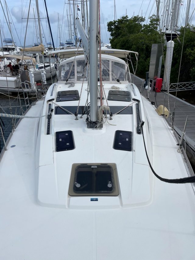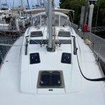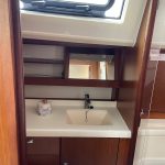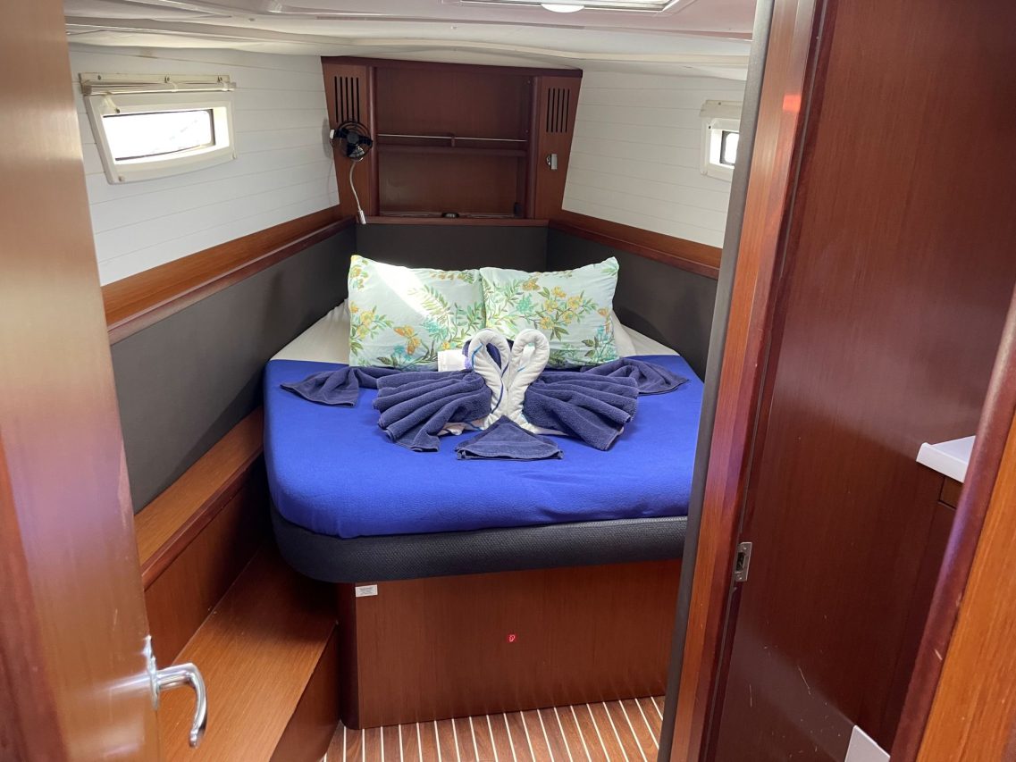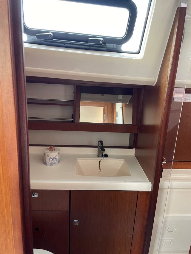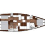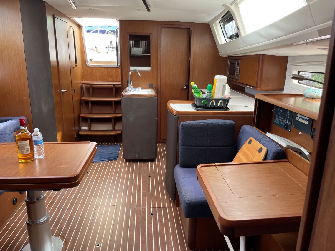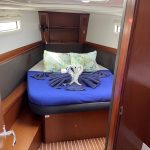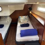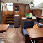 On deck, twin helms, an expansive cockpit with adjustable table, and a fold-down swim platform ensure practical and enjoyable sailing or entertaining. Sail handling is straightforward, ideal for shorthanded crews.