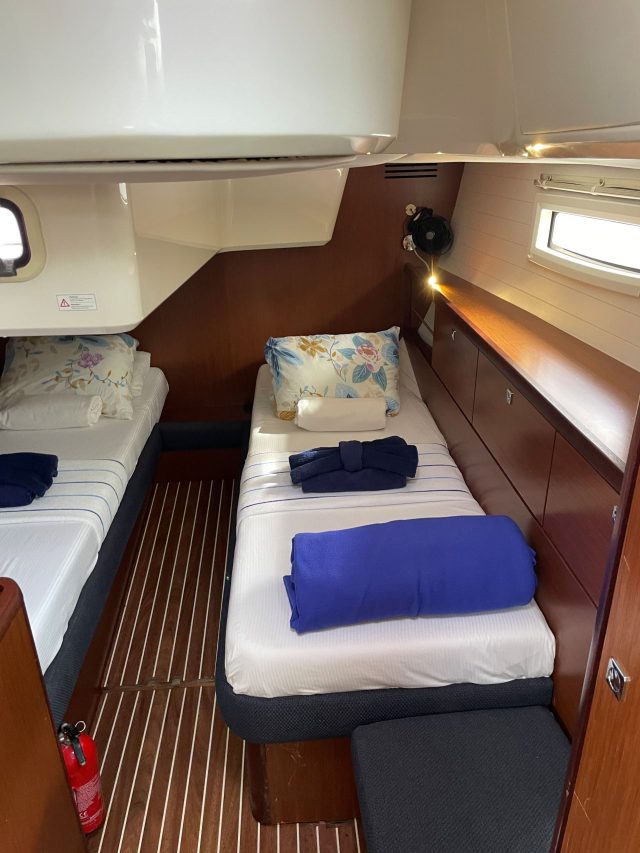 Offering a two-double cabin, one-twin singles cabin, and a three-head layout, the bright interior features an L-shaped dinette, flexible saloon, and a well-appointed galley. Large hull windows and hatches provide abundant natural light throughout.