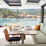 A drone view of a catamaran yacht anchored in a Mediterranean bay surrounded by dark emerald water